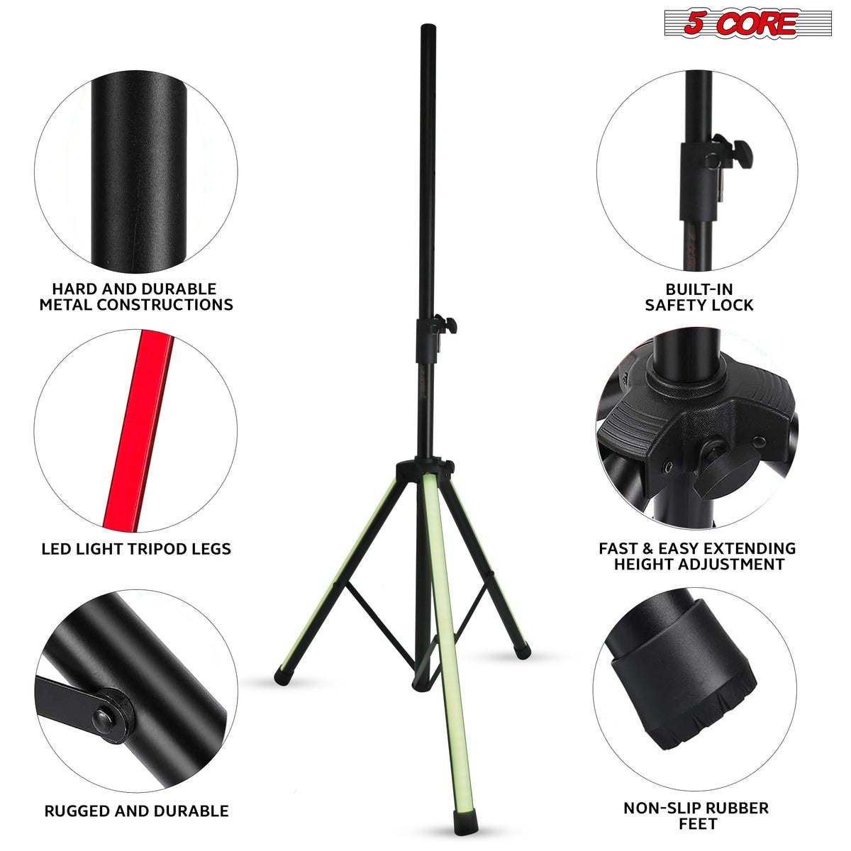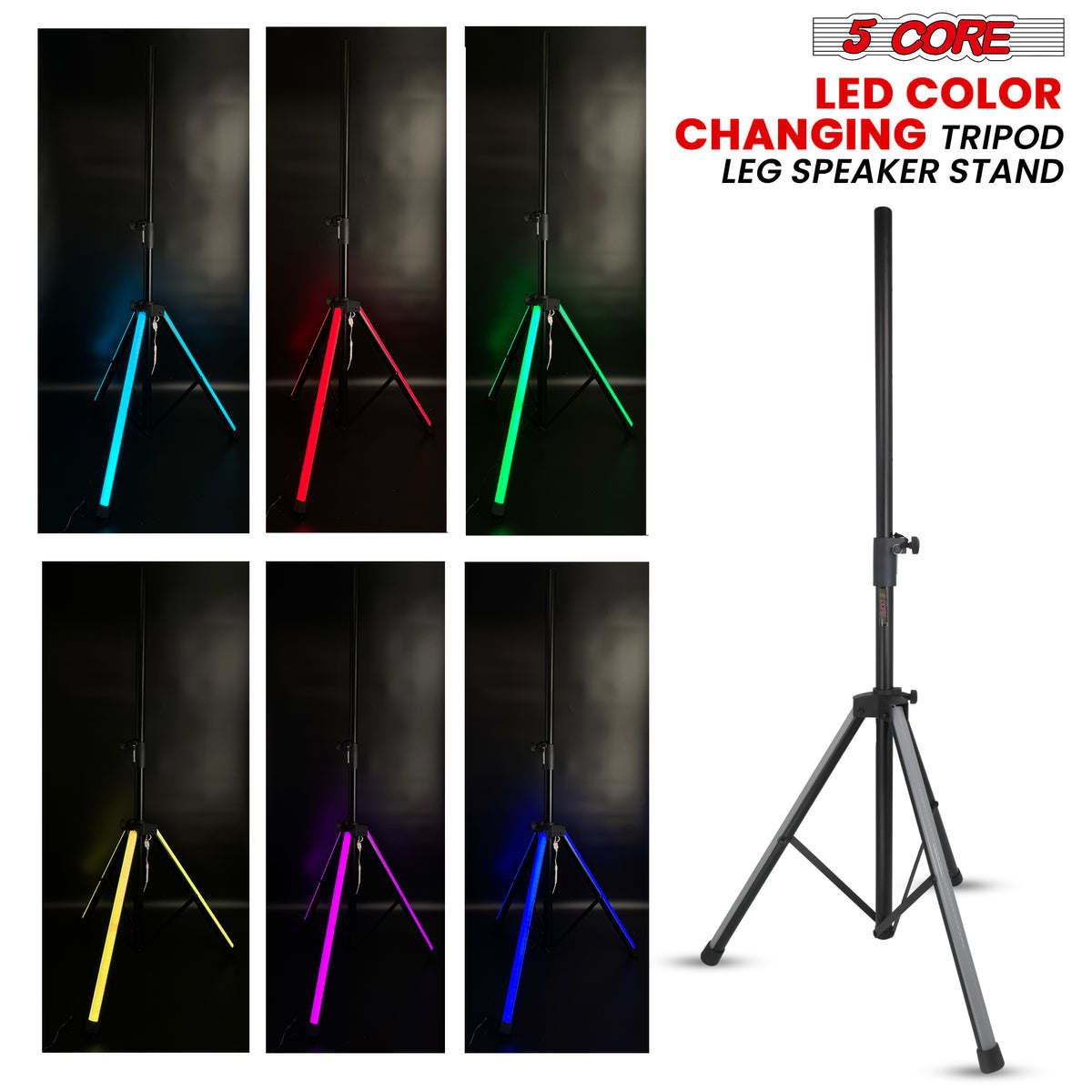 PA Speaker Stand with Colorful LED Lights in all 3 tripod legs. 16 distinct color options and 4 stylish programmed transitions.