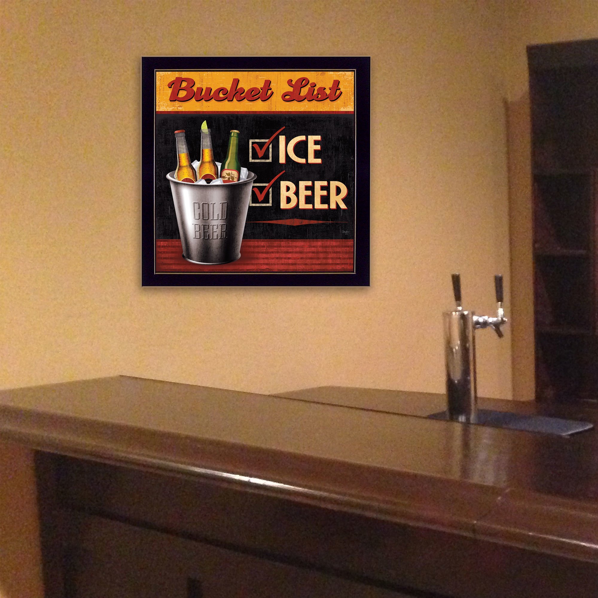 MOL1523-712, "Bucket List" is a 14"x14" framed art print by Mollie B. framed in a decorative black frame. This print will get the laughs in any man-cave. The print has a protective, archival finish (glass is not needed) and arrives ready to hang. Made in the USA with pride by skilled American workers.•Women Owned (WBE)•Textured Artwork with a 'rolled on' acid free acrylic coating to create a canvas painting effect. No glass is necessary.•UV protectant coating protects artwork from fading.•Arrives Ready to Hang