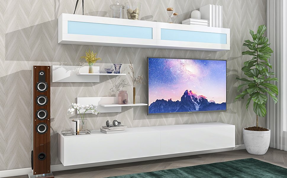 Home > ON-TREND Wall Mount Floating TV Stand with Four Media Storage Cabinets and Two Shelves, Modern High Gloss Entertainment Center for 95+ Inch TV, 16-col