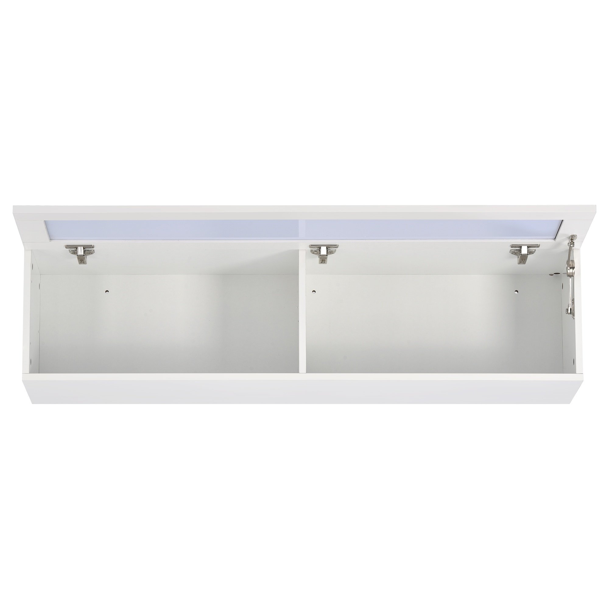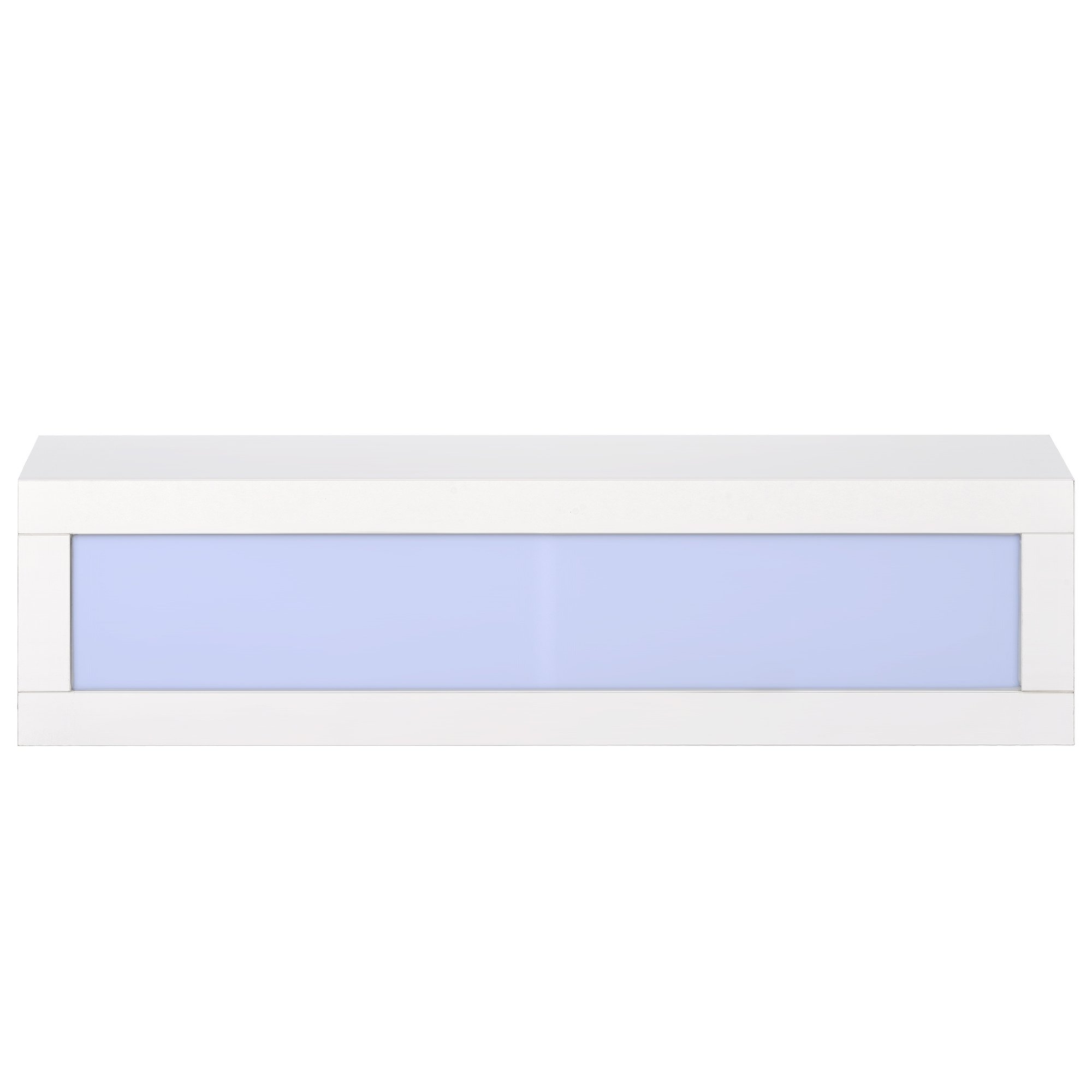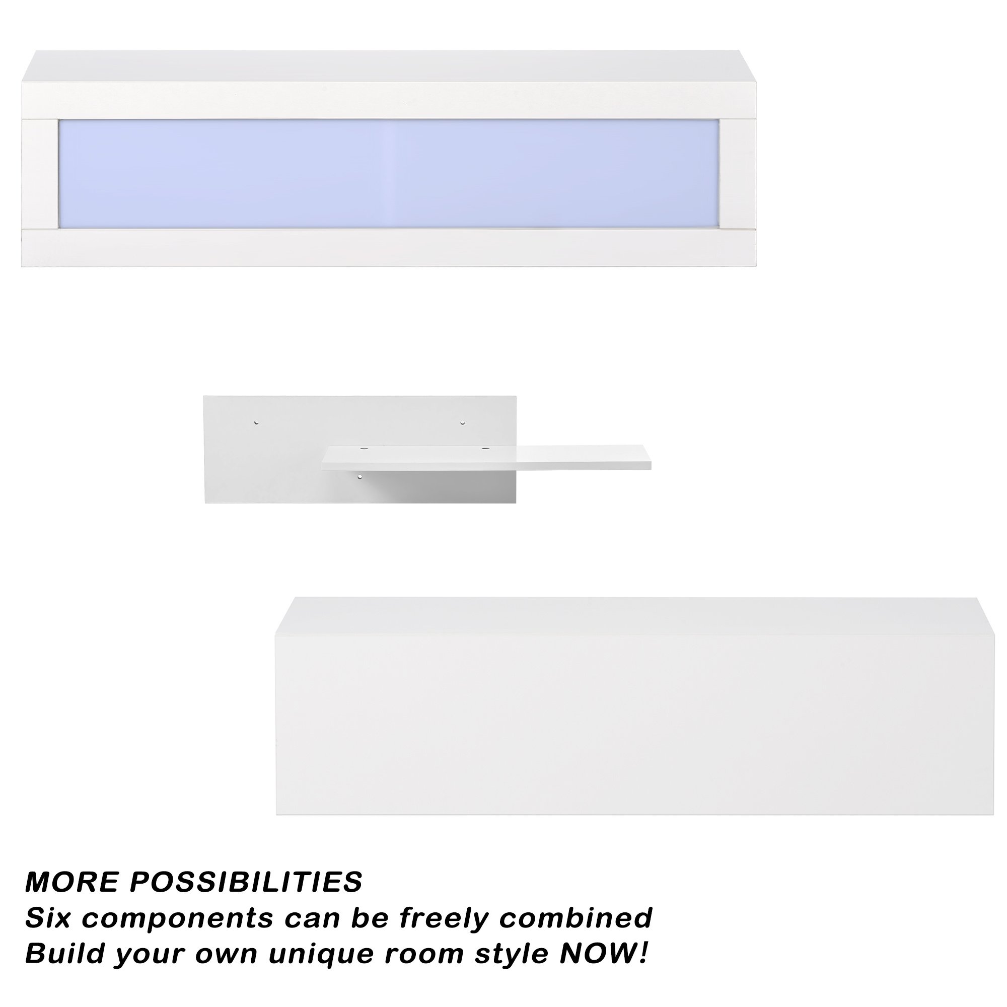 Product TypeFloating Entertainment CenterTop ShapeRectangleTop ColorWhiteTop MaterialMDFTop Finish ApplicationVeneerBase ColorWhiteBase MaterialMDFBase Finish ApplicationVeneerBuilt-In LightingYesWeight Capacity277.2lbsShelves IncludedYesNumber of Shelves2Cabinets IncludedYesNumber of Cabinets4Country of OriginChinaTable Top Thickness0.59inch