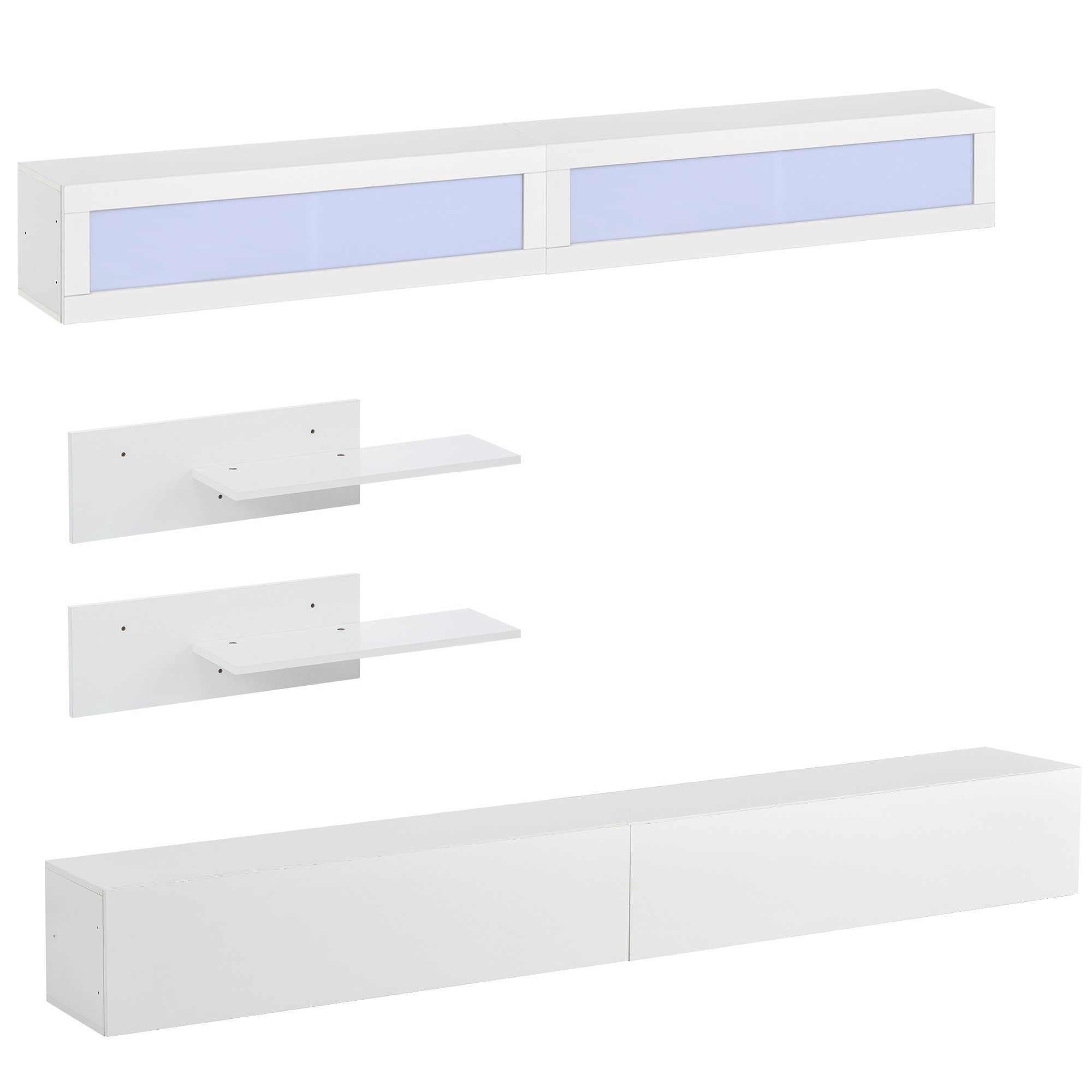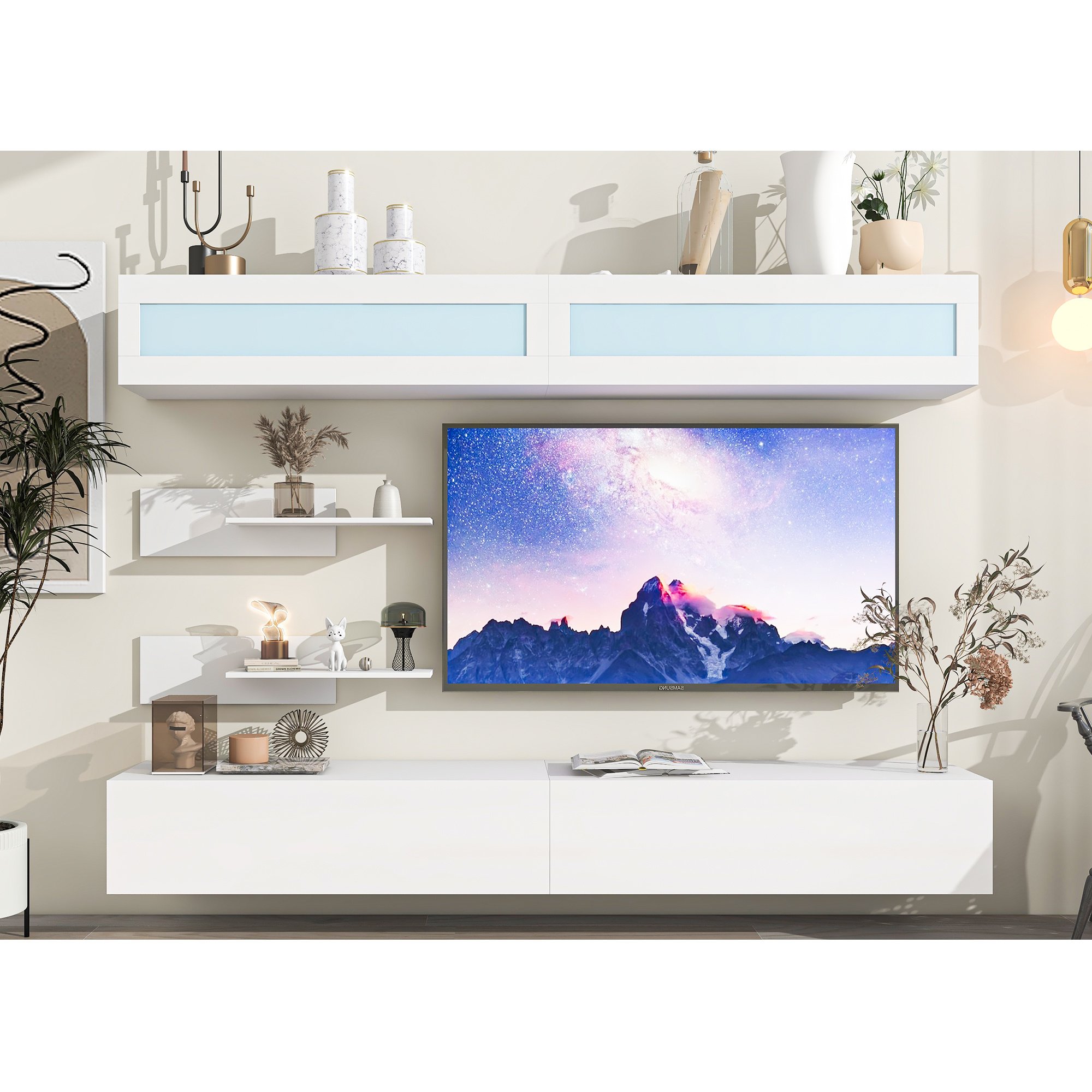 ON-TREND Wall Mount Floating TV Stand with Four Media Storage Cabinets and Two Shelves, Modern High Gloss Entertainment Center for 95+ Inch TV, 16-col
